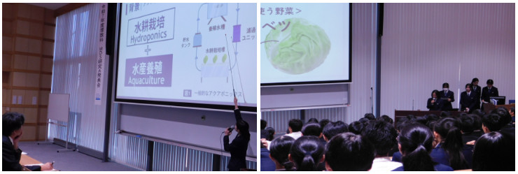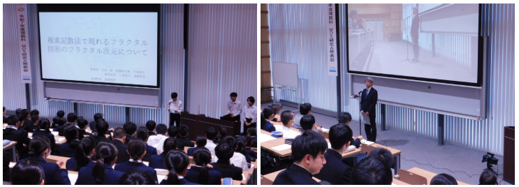 2年理数科の生徒が各班ごとにとり組んでいる課題研究の研究成果を大講堂で発表。1年生は大講堂で直接発表を聞き、2年生は各教室に配信された映像を見る形式で実施されました。また、発表会の後には参加してくださった大曲農業高校 大沼克彦先生、秋田県立大学草刈良尚先生、梅津康由先生、小谷光司先生から今後の研究の深め方についてアドバイスをいただく時間を取ることができました。