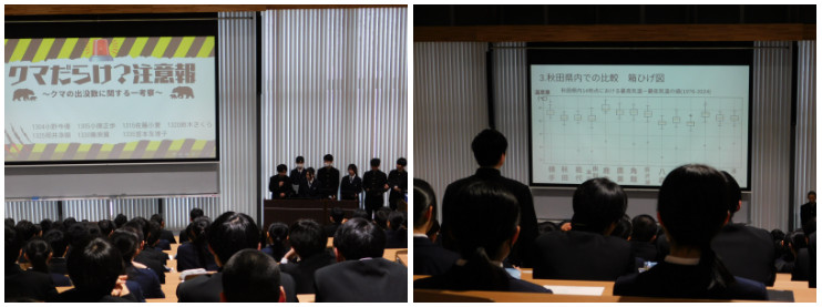 2026年1月28日(火)MDS基礎学年発表会が大講堂で実施されました。この発表会は、1年生が班ごとにとり組んだ研究について、各クラス代表班1班、6つの班の研究成果を学年で共有するものとして実施されたものです。