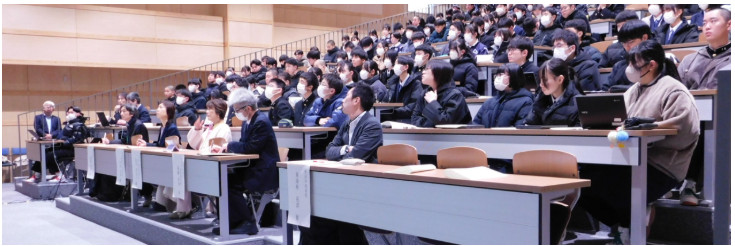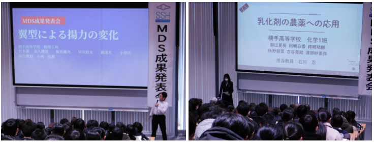この発表会は、2年生で実施している理数科のMDS探究Aと普通科のMDS探究Bの科目でとり組んだ研究について、代表班によるプレゼンテーション発表を行ったもので、1年生は大講堂で、2年生は各教室でオンラインで参加して実施されました。外部からはSSH運営指導委員の先生方6名(オンラインでの参加も含)のほか、県教育委員会から指導主事の先生、他校の先生も参加していただき、発表後には講評をいただきました。